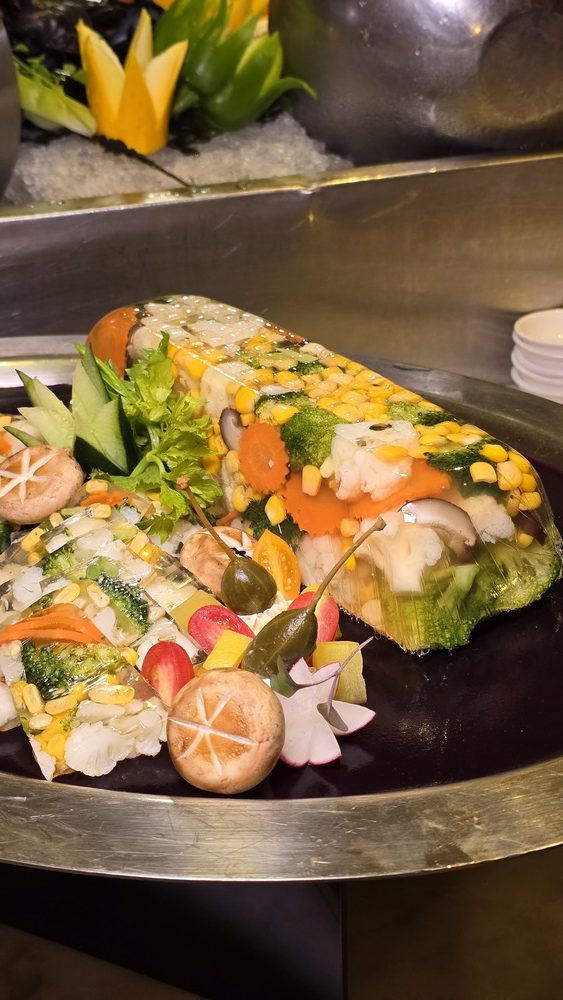 The meal starts on a bright, flavourful note with the Home-Cured Beetroot Salmon Gravlax, a dish that impresses visually and in taste. The salmon, delicately cured and subtly sweet, pairs beautifully with the earthy hint of beetroot — a refreshing opening to the feast. The Classic Terrines, such as the Pâté en Croûte and Dodine de Canard with Pistachio, add depth and French flair, offering a balance of savoury richness and buttery texture. I particularly enjoyed the Rainbow Vegetable Terrine, which brings lightness to the platter with its crisp, garden-fresh profile.