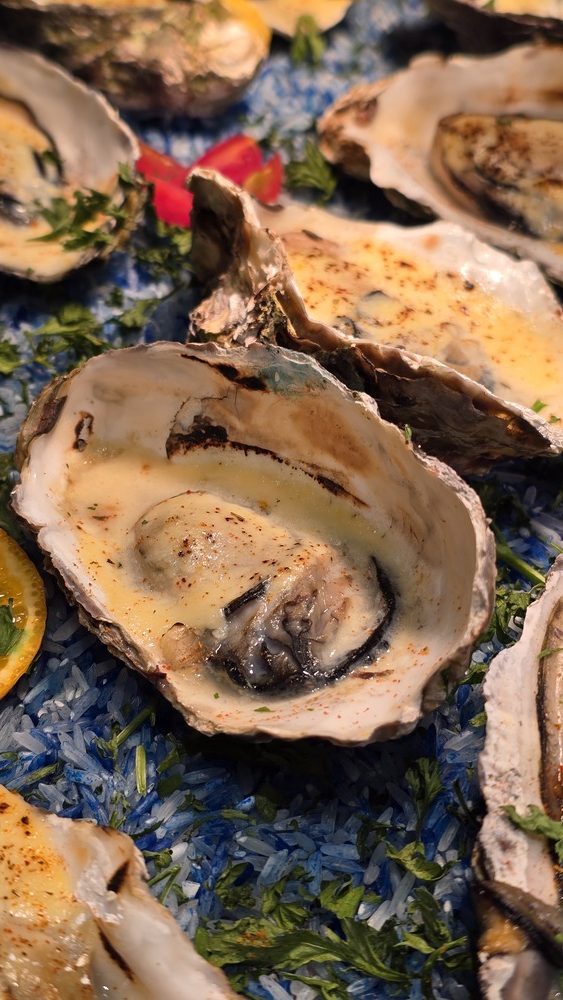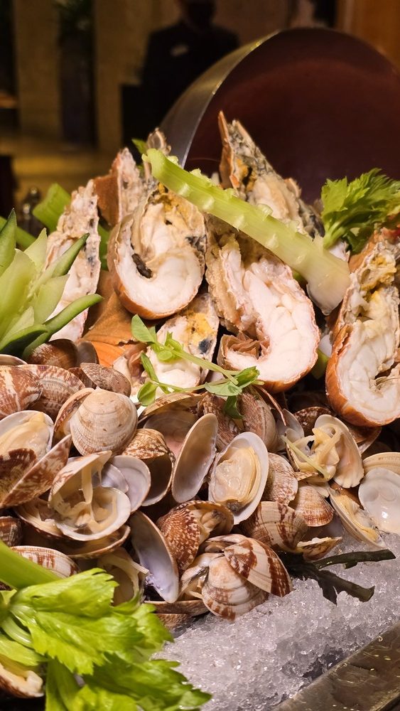 Seafood lovers are in for a treat at the Seafood on Ice station. The Slipper Lobsters and Flower Crabs are fresh and naturally sweet, complemented by the briny depth of Black Mussels and Sar Pak Clams. The Gratin of Oysters stands out — warm, creamy, and topped with golden crumbs that melt in your mouth, a luxurious contrast to the icy freshness of the rest.