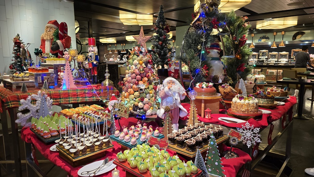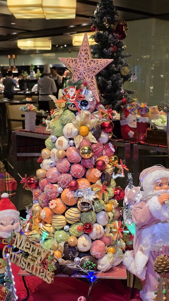 The dessert corner is equally impressive, crowned by the Profiterole Christmas Tree — a towering creation of choux pastries filled with velvety cream and drizzled in glossy chocolate. The pastry is light, the cream just sweet enough, and together they bring that nostalgic taste of holiday happiness.