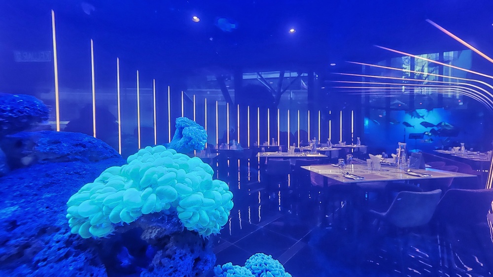 The moment you step into Atlantis Seafood Restaurant & Bar, you’re greeted by an interior that masterfully captures the allure and wonder of the ocean. The grand hall is dominated by a mesmerizing aquarium centerpiece that immediately draws you in, surrounded by lifelike sculptures of sea creatures, including a stunning octopus that seems to come to life amidst the ambient glow. Above, illuminated fish sculptures swim through the air, casting a magical ambiance across the space. This carefully curated environment sets the stage for an evening of culinary delights and vibrant energy, amplified by live band performances that add a rhythmic touch of romance and excitement.