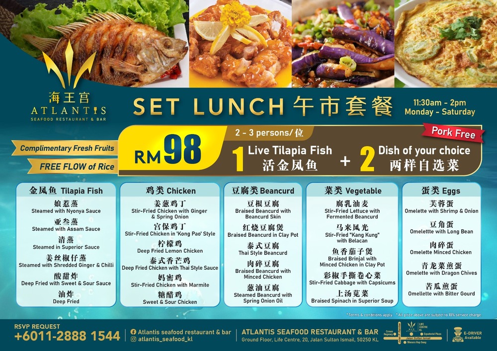 For those looking to enjoy a delightful midday meal, Atlantis Seafood Restaurant & Bar offers a set lunch from Monday to Sunday, between 11:30am to 2:00pm, perfect for 2-3 people. Priced at RM 98, this set includes a choice of live Talapia fish, either steamed or deep fried, accompanied by two dishes from their selection of chicken, beancurd, vegetables, or eggs. To round off the meal, guests are treated to complimentary fresh fruits and free flow of rice, ensuring a satisfying and value-for-money dining experience.