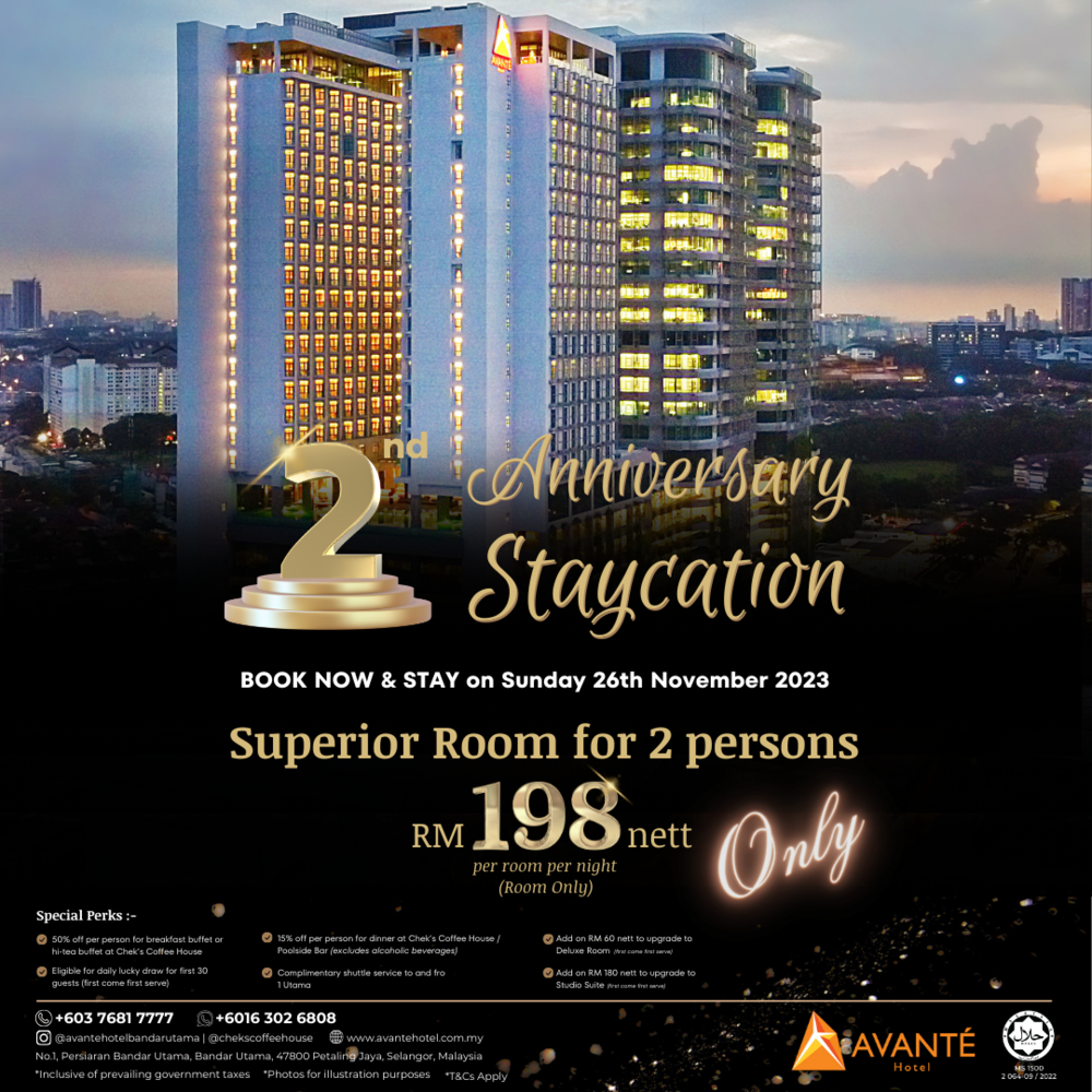 For further details or to make a reservation, please visit https://www.avantehotel.com.my, send an email to reservations@avantehotel.com.my, or call +6 03 7681 7777. Celebrate AVANTÉ Hotel’s 2nd anniversary with an unforgettable staycation experience!