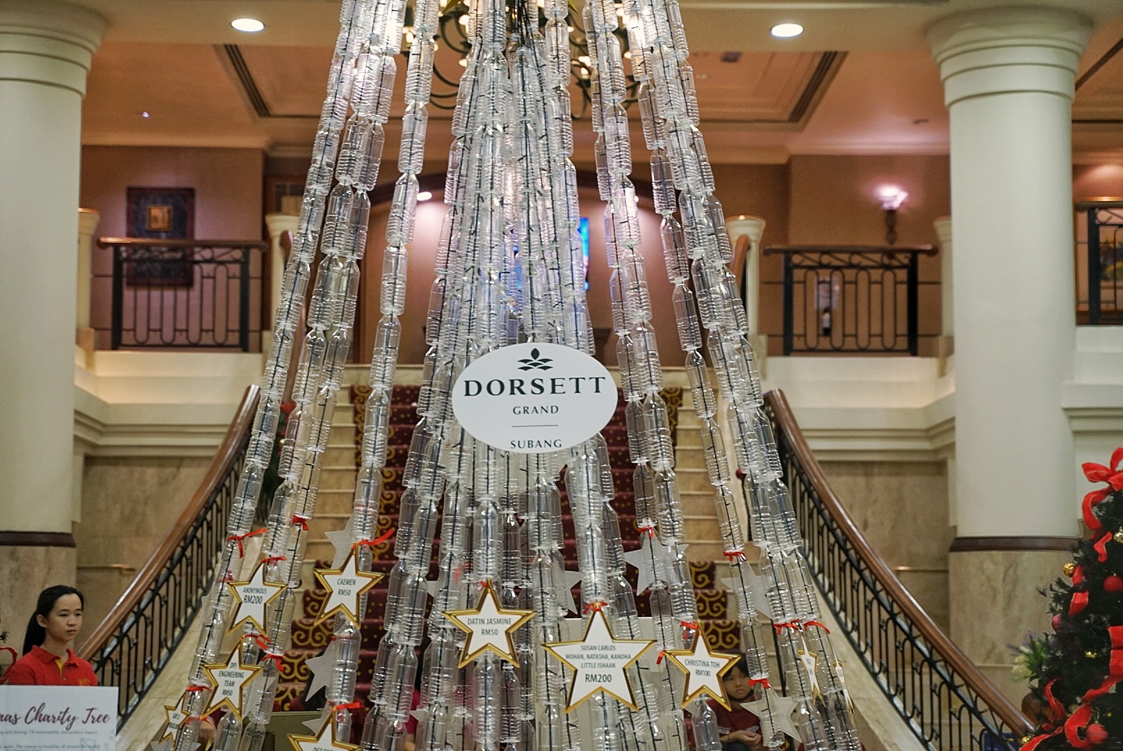 Christmas is also a time to share and give. Let’s not forget the less fortunate. At Dorsett Grand Subang, a magnificent Christmas Tree has been erected by the hotel’s Engineering Team. The tree is made by stringing 576 empty RO bottles together using fairy lights wire. With a minimum contribution of RM10, donor/s’ names will be displayed on this Tree of Light; proceeds will be channelled to the Paediatric Ward of the National Heart Foundation.