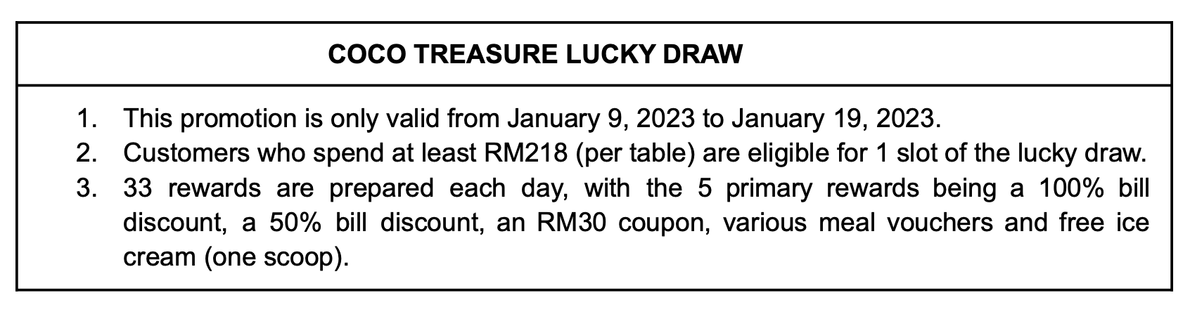 The overall theme of the COCO Chinese New Year campaign this year would be Celebrating 2023 “Tu”’Gether,” with “Tu” signifying the Rabbit, the year’s Chinese zodiac animal, with the intent of ushering in a prosperous and joyous new year. As part of the celebration, three special offers have been arranged, including the much-anticipated Treasure Luck Draw, Ong Your Table Lah!, and Give You Extra Ong Lah!