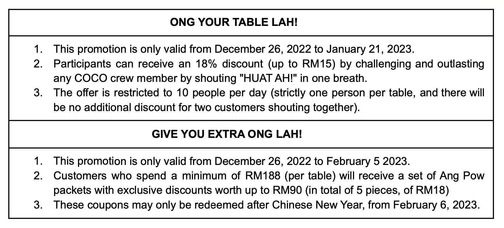 Customers who are unable to participate in the lucky draw may still receive an 18% discount (up to RM15) through (1) Ong Your Table Lah! by just screaming “HUAT AH!” at any one of the COCO crew at the checkout counter – a fun challenge that needs to be completed in a single breath; the longer you go, the higher the chance to win. To add more joy, COCO has designed and prepared ONG-filled COCO red Ang Pow packets, which carry exclusive COCO coupons that can be obtained under the (2) Give You Extra Ong Lah! offer. These Ang Pow packets can serve as “profit” for personal use or can be handed as a gift to family and friends.