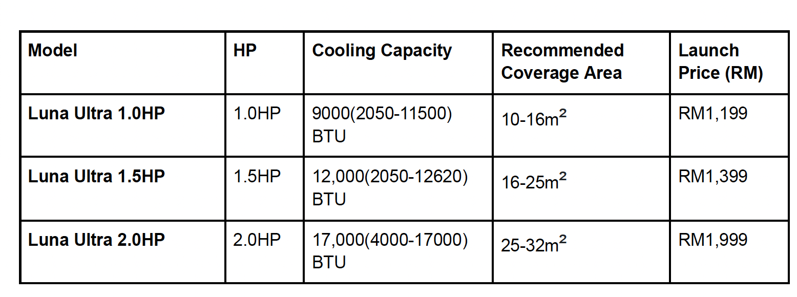 Engineered for powerful cooling and exceptional efficiency, the Luna Ultra consumes up to 45% less electricity compared to the lowest rated 2-star non-inverter models, setting a new benchmark for value-driven performance. Available in 1.0HP, 1.5HP, and 2.0HP, the Luna Ultra delivers premium inverter technology at an accessible price point, starting from just RM1,199 for the 1.0HP model.