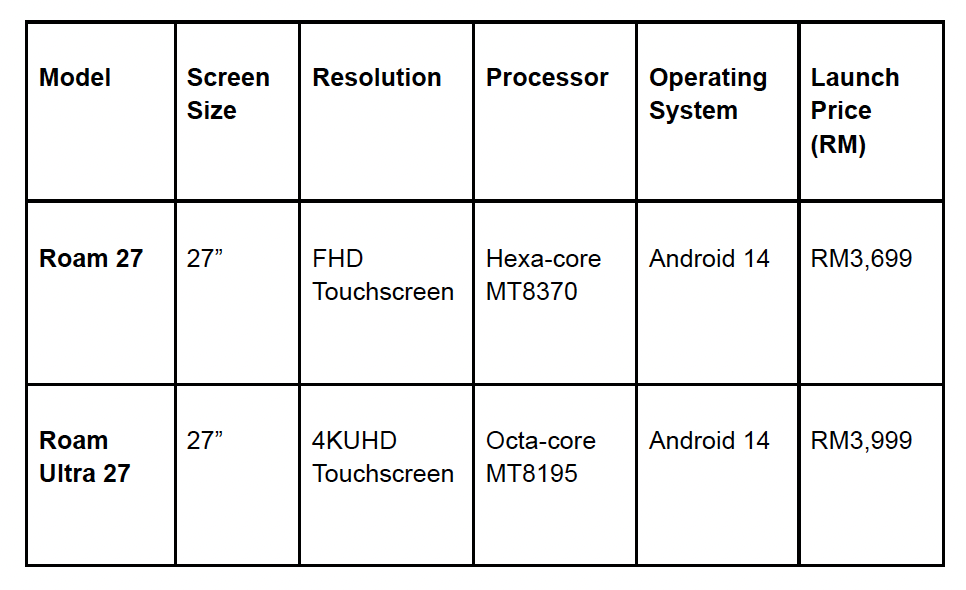 The two models offer different performance tiers to cater to various usage scenarios. The PRISM+ Roam 27″ features a Full HD touchscreen, IPS panel, Octa-core processor, and Android 14 OS, delivering smooth performance for productivity apps, meetings, tutorials, and streaming. Meanwhile, the Roam Ultra 27″ elevates the experience with a 4K UHD touchscreen, IPS panel, Hexa-core MT8370 processor, and the capability to handle more demanding applications with greater visual clarity. Both models come with a 3-year warranty, providing long-term reliability and confidence for everyday use. The Roam 27″ series is priced accessibly, starting from RM3,699. Before diving into its features, the Roam family stands out as a versatile smart display solution built for dynamic lifestyles–offering strong performance, a clean interface, and effortless mobility.