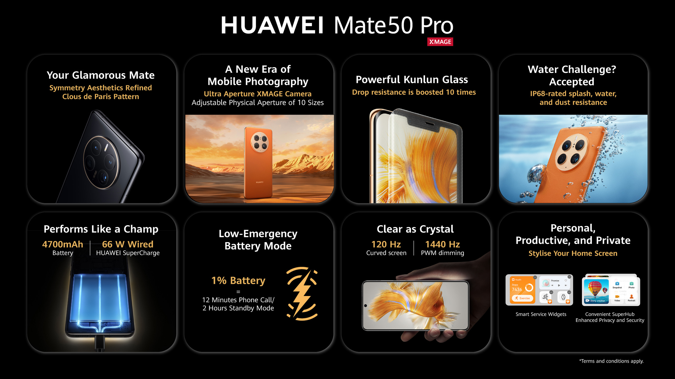 Available in three variants, HUAWEI Mate50, HUAWEI Mate50 Pro and HUAWEI Mate50 Pro Orange Vegan Leather, the flagship phones are the latest performance-driven smartphones which claims to equipts with a breakthrough technology and innovations that are more powerful than ever with: