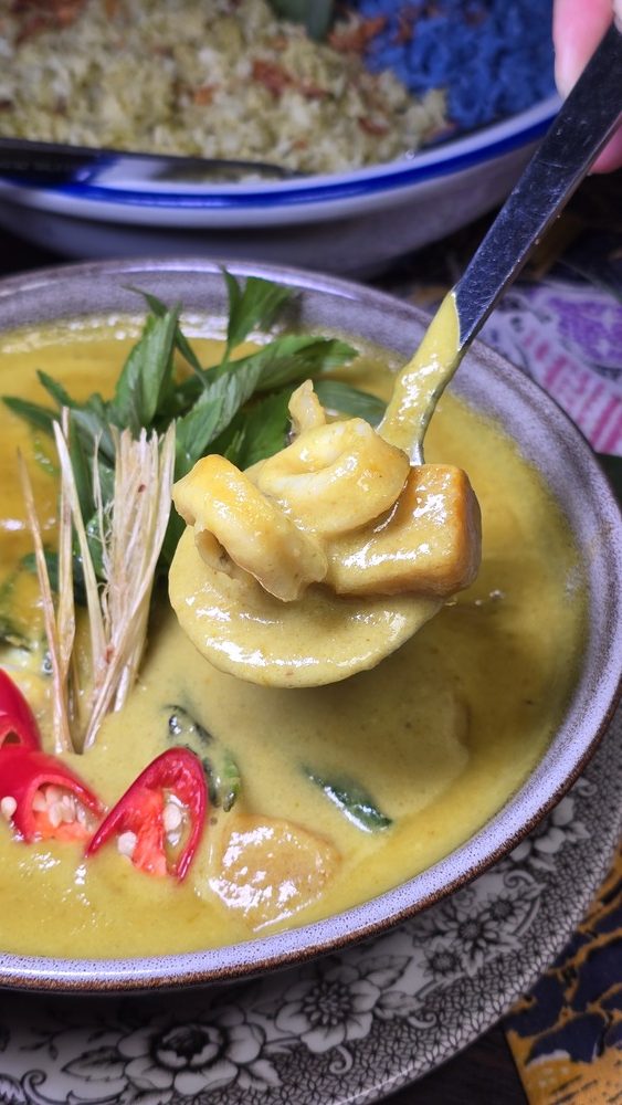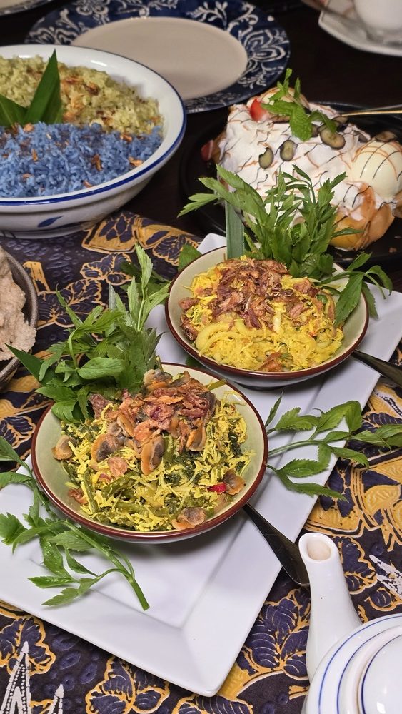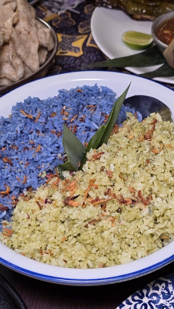 Ayam Pandan Tender pieces of chicken are marinated with a blend of local herbs and spices, then wrapped in fragrant pandan leaves and fried to perfection. The result is a dish that is both aromatic and succulent, with the pandan imparting a subtle sweetness that elevates the overall flavor profile. Nasi Beringin & Nasi Bunga Telang These two rice varieties serve as the perfect accompaniments to the main dishes. The Nasi Beringin offers a delicate, herb-infused flavor, while the Nasi Bunga Telang, with its vibrant blue hue derived from butterfly pea flowers, adds a visual appeal and a hint of floral undertones to the meal.