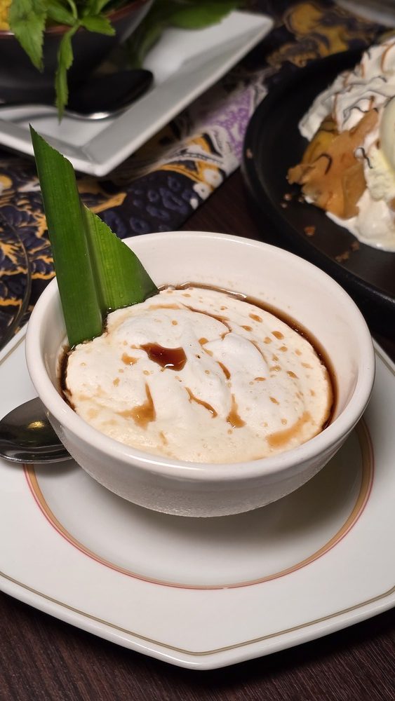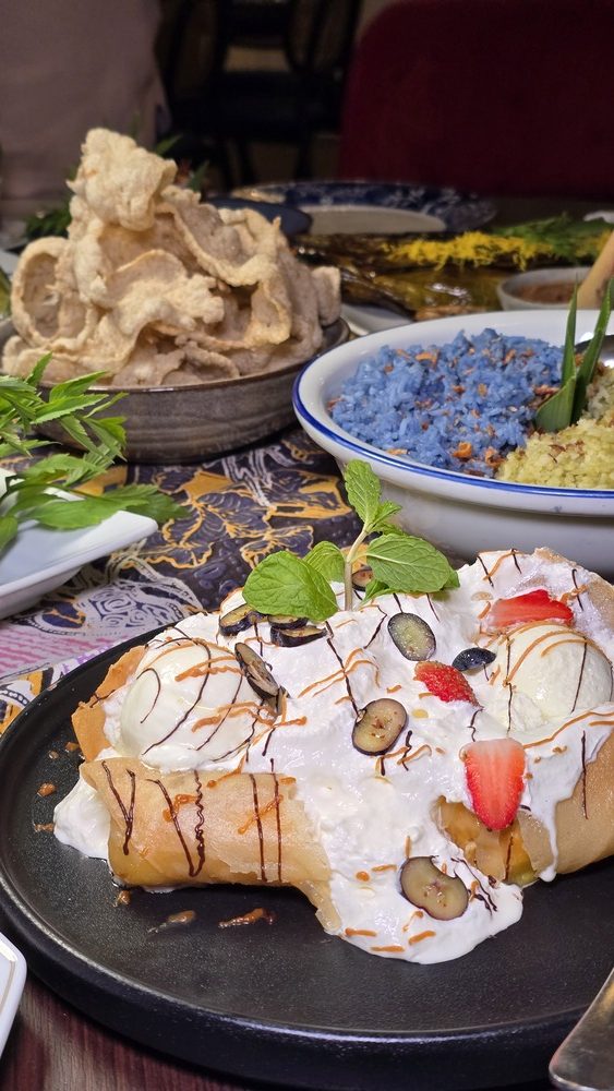 Kerabu Mangga Ikan Bilis & Kerabu Pucuk Paku Kerang These refreshing salads provide a balance to the richness of the main dishes. The Kerabu Mangga combines the tanginess of mango with the crunch of anchovies, while the Kerabu Pucuk Paku blends tender fern shoots with the brininess of cockles, all tossed in a zesty dressing. The Banana Roll Caramel offers a refined balance of textures—crispy pastry encasing soft banana, finished with a glossy caramel drizzle that adds just the right note of sweetness. Bubur Sumsum To conclude the meal, the Bubur Sumsum offers a comforting finish. This smooth rice flour pudding is drizzled with rich gula Melaka syrup, providing a sweet and satisfying end to the dining experience.