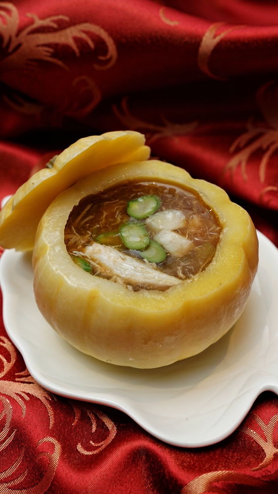 Toh Yuen’s Braised Crab Meat Broth with Scallop and Asparagus in Mini Pumpkin Soup is a unique offering that combines the richness of seafood with the sweetness of pumpkin. Served in a mini pumpkin, this dish not only delights the palate but also makes for a visually stunning presentation.