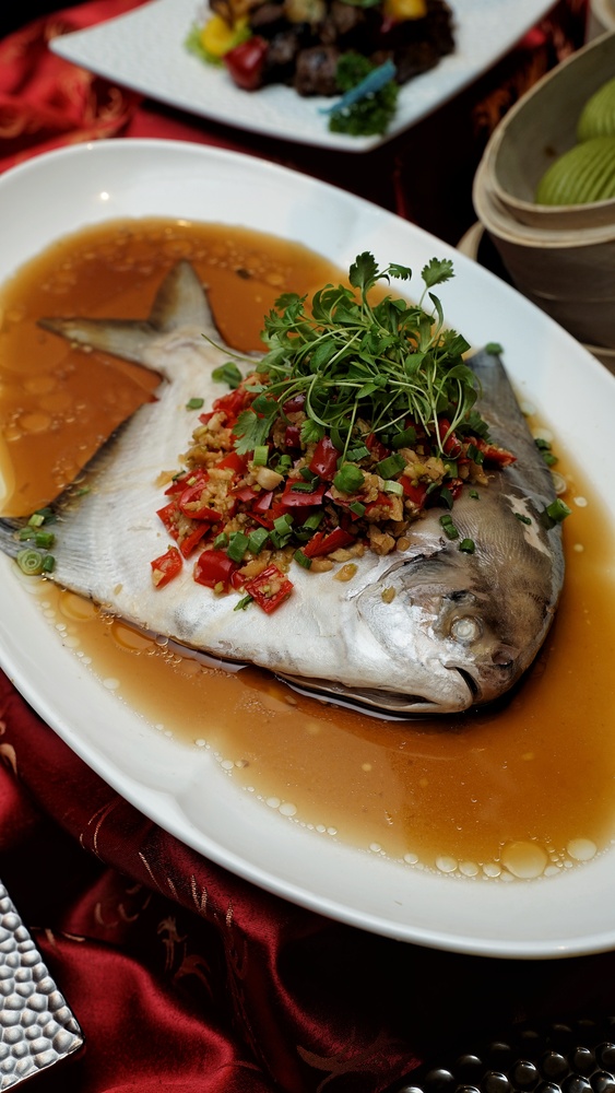 – Steamed Pomfret with Pickled Red Chilli and Minced Ginger – This dish features perfectly steamed fish, balanced with the subtle heat of pickled red chili and the freshness of ginger.