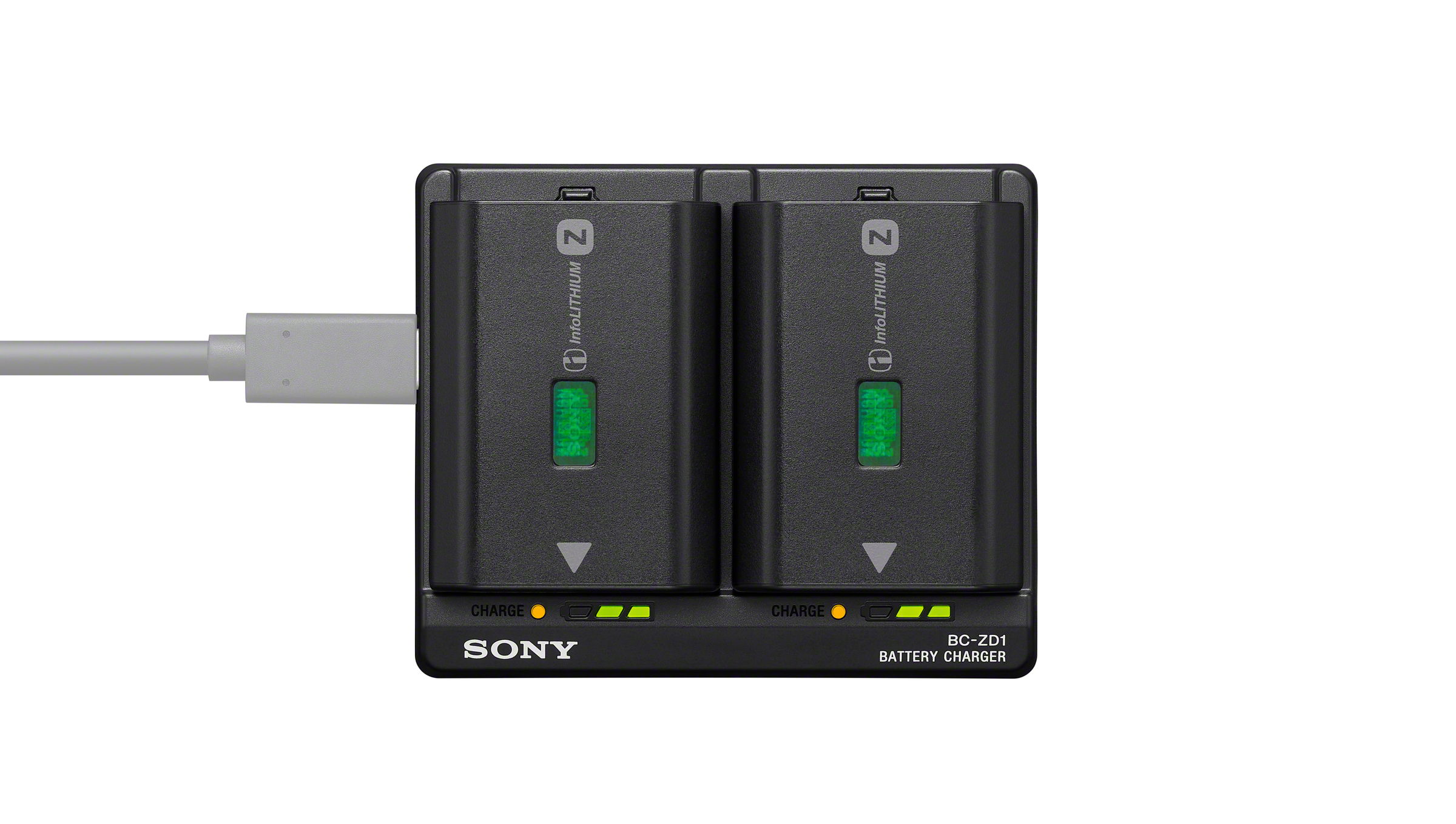 The BC-ZD1 is a high-speed charger for Sony’s high-capacity NP-FZ100 batteries . It can simultaneously charge two batteries in approximately 155 minutes (full charge ) when connected to a USB Power Delivery (PD) compatible power supply with 30W or higher output and a USB cable with USB PD support (3 A) or higher current.