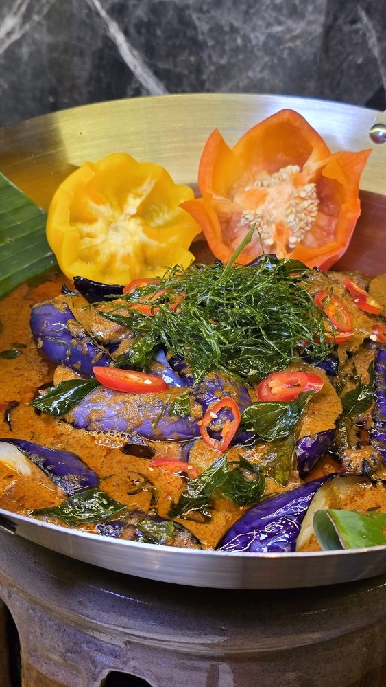 For a comforting vegetable dish, Pajeri Terung stands out — tender eggplant cooked in creamy coconut milk with turmeric, chili, onion, garlic, tamarind, and a blend of aromatic spices, giving it a gentle richness that complements the heavier mains.