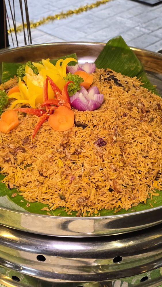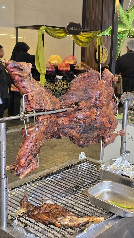 At the heart of the buffet is the Kambing Golek, commanding attention at the carving station. The lamb is slow-roasted to a beautiful mahogany hue, its outer layer lightly crisp while the meat beneath remains tender and succulent. Paired with fragrant nasi beriani kambing, the combination is deeply satisfying — the rice fluffy and perfumed with spices, each grain carrying the warmth of cloves and cardamom without overwhelming the palate.